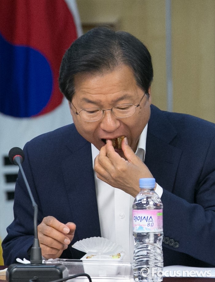 (서울=포커스뉴스) 2일 오전 서울 여의도 국회 의원회관에서 열린 국민의당 정책역량강화 집중 워크숍에 참석한 천정배 공동대표가 샌드위치를 먹고 있다.