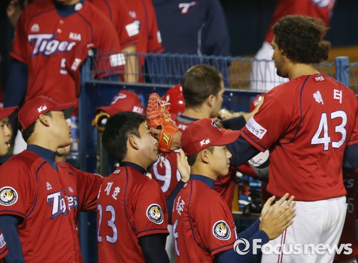 (서울=포커스뉴스) 1일 서울 잠실구장에서 열린 2016 프로야구 KIA-LG 경기에서 KIA 투수 헥터가 7회말 실점 위기를 넘기고 덕아웃으로 들어가며 동료들의 환영을 받고 있다.