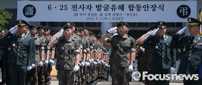 (대전=포커스뉴스) 2일 오전 대전 유성구 국립대전현충원에서 열린 6.25 전쟁 전사자 발굴유해 합동안장식에서 장병들이 거수경례를 하고 있다.