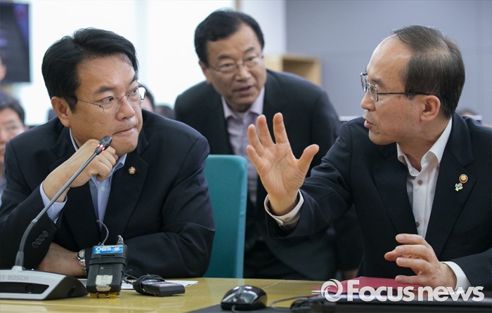 (서울=포커스뉴스) 미세먼지 대책과 관련해 현장 방문에 나선 정진석(왼쪽) 새누리당 원내대표가 1일 오후 서울 동작구 기상청 종합상황실을 방문해 윤성규 환경부 장관과 대화하고 있다.
