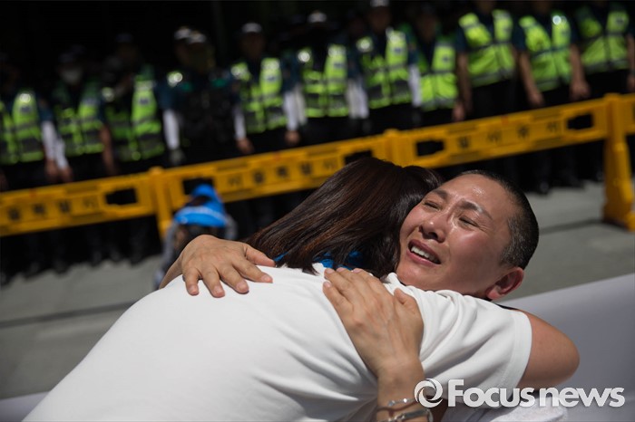 (서울=포커스뉴스) 2일 오후 서울 중구 서울시청 정문 앞에서 장애인부모연대원이 발달장애인 정책수립을 촉구하며 삭발식을 마친 뒤 참석자와 포옹하고 있다.