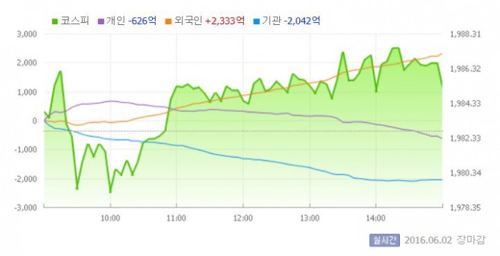 이날 코스피는 전일대비 1.14포인트 오른 1983.86로 장을 시작했다. 이후 지수는 기관의 매도 공세에 하락세로 돌아섰다. 그러나 장 중 외국인이 강한 매수세를 보이자 다시 상승세로 방향을 바꿨다. 외국인은 이날 2300억원 넘는 주식을 사들였다.