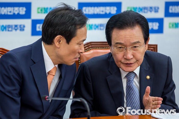 (서울=포커스뉴스) 우상호(왼쪽) 더불어민주당 원내대표와 변재일 정책위의장이 2일 오전 서울 여의도 국회에서 열린 정책조정회의에 참석해 대화를 나누고 있다.