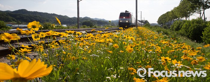 (충주=포커스뉴스) 2일 오후 충북 충주시 장성리에서 금계국 사이로 열차가 지나고 있다.