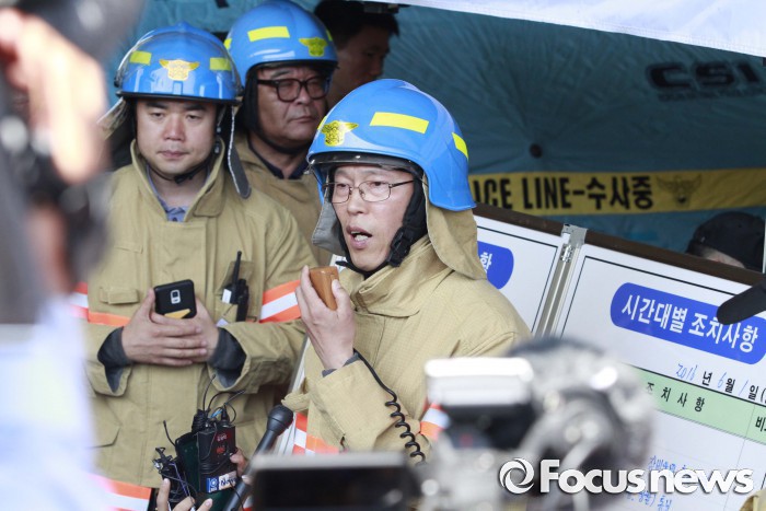 이어 "현재 이 사고는 전담 수사본부에서 조사하고 있다. 관계 부처와 공조해서 이 부분에 대해 다시 조사하겠다"고 밝혔다.1일 오전 경기 남양주시 진접역 공사현장 폭발사고 관련 브리핑을 하고 있는 김진선 남양주 소방서장. (남양주=포커스뉴스) 1일 오전 7시 20분께 경기 남양주시 진전읍 금곡리 진접석 지하철 공사현장이 붕괴되는 사고가 발생해 소방대원들이 구조작업을 하고 있다. 2016.06.01 김인철 기자