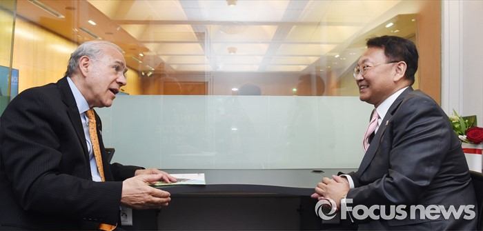 (서울=ㅍ커스뉴스) 2016년 OECD 각료이사회에 참석차. 프랑스 파리를 방문중인 유일호 부총리 겸 기획재정부 장관이 6월 1일 OECD에서 앙헬 구리아 OECD 사무총장과 면담을 하고 있다. <사진제공=기획재정부>