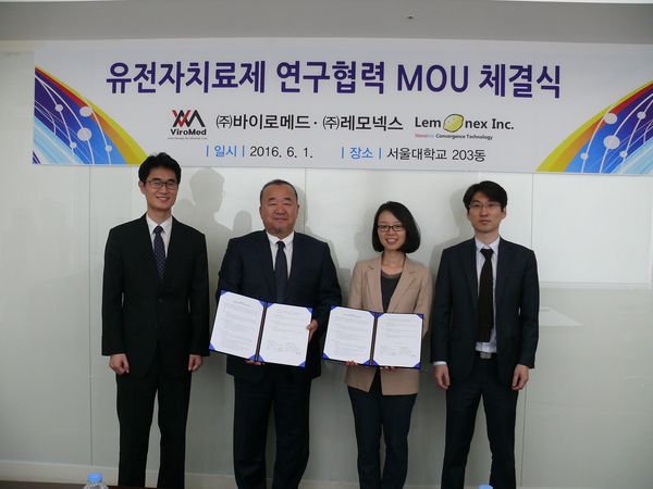레모넥스는 바이오 의약품, 바이오 신소재 및 그래핀 바이오센서 등을 개발하고 있으며, 유전자 치료제 및 단백질 의약품의 전달 효율을 극대화 시킨 서방형의 비바이러스성 약물전달 기술을 보유하고 있다.왼쪽부터 바이로메드 정재균 연구소장, 바이로메드 김용수 대표이사, 레모넥스 민달희 공동대표, 레모넥스 원철희 공동대표. <사진출처=바이로메드>