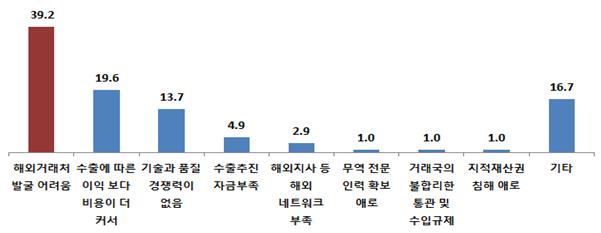 수출 중단 원인으로는 '해외거래처 발굴 어려움'이 39.2%로 가장 높았다. 또 '수출에 따른 이익보다 비용이 더 커서'(19.6%), '기술과 품질 경쟁력 부족'(13.7%) 등이 뒤를 이었다. 중소기업에 대한 일반적 인식인 자금·인력 부족은 상대적으로 낮게 나타났다.