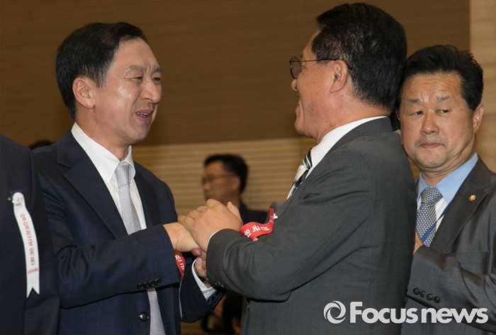 (서울=포커스뉴스) 2일 오후 서울 여의도 국회 의원회관에서 열린 새누리당 4차 전국위원회에 참석한 김기현(왼쪽) 울산시장과 정운천(가운데) 의원이 인사하고 있다.