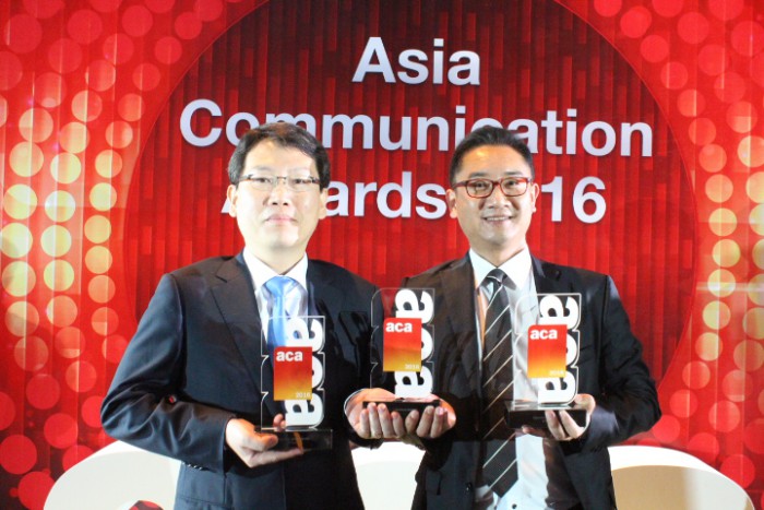 강국현 KT 마케팅부문장은 “이번 수상을 통해 KT가 기가 LTE와 같은 기존에 없던 차별화된 서비스로 통신시장을 선도하고 있다는 것을 세계에서 다시 한번 인정받았다”고 말했다.지난 1일 저녁 싱가폴 메리어트 탐 프라자 호텔에서 진행된 ‘아시아 커뮤니케이션 어워드’ 현장에서 마케팅전략담당 허석준 상무(오른쪽)가 수상 기념 촬영을 하고 있다.<사진제공=KT>