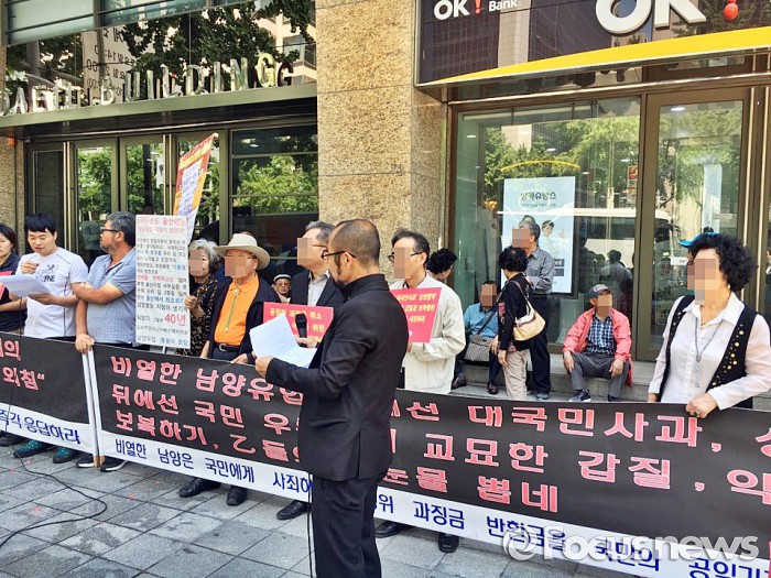 2일 서울 중구 대일빌딩 앞에서 이창섭 옛 남양유업 피해자 협의회장의 주도로 본사를 규탄하는 시위가 열렸다. 이창섭 회장은 2013년 당시 남양유업 갑의 횡포 사건의 중심에 있었던 인물이다.