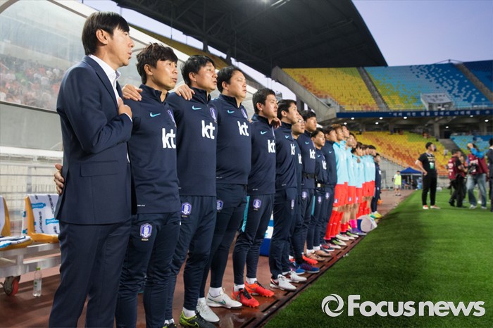 (수원=포커스뉴스) 2일 오후 경기 수원월드컵경기장에서 열린 2016 4개국 올림픽국가대표 축구대회 대한민국과 나이지리아의 경기에서 신태용 감독과 코치진이 애국가를 부르고 있다.