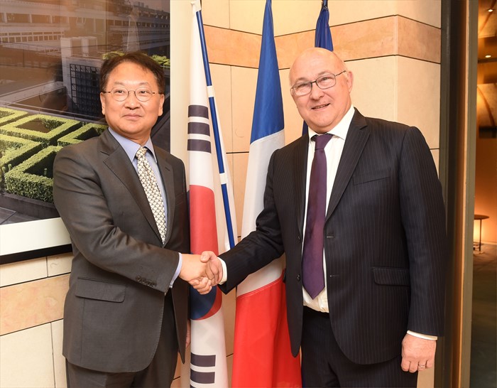 (서울=포커스뉴스) 2016년 OECD 각료이사회에 참석차. 프랑스 파리를 방문중인 유일호 부총리 겸 기획재정부 장관이 2일 재무부에서 미셸 사팽 프랑스 재무장관과 면담에 앞서 악수하며 기념사진을 찍고 있다. <사진제공=기획재정부>