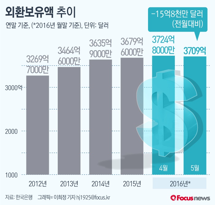 (서울=포커스뉴스) 3일 한국은행은 '2016년 5월말 외환보유액' 자료를 통해 올 5월 외환보유액이 3709억달러로 지난달보다 15억8000만달러 줄어들었다고 밝혔다. 올 4월 말 기준 국내 외환보유액 규모는 세계 7위 수준이다.