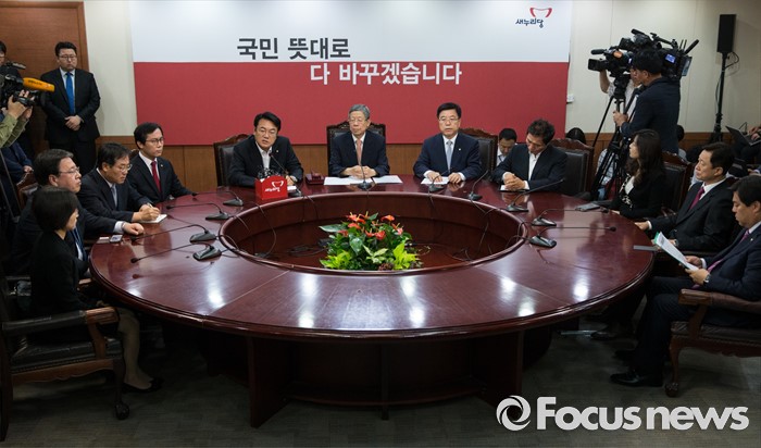 (서울=포커스뉴스) 김희옥(가운데) 새누리당 비상대책위원장과 정진석(왼쪽 다섯번째) 원내대표를 비롯한 비대위원들이 3일 오전 서울 여의도 새누리당 당사에서 열린 비상대책위원회의에 참석하고 있다.