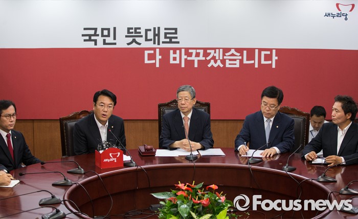 (서울=포커스뉴스) 김희옥(가운데) 새누리당 비상대책위원장과 정진석(왼쪽 두번째) 원내대표가 비대위원들과 함께 3일 오전 서울 여의도 새누리당 당사에서 열린 비상대책위원회의에 참석해 회의하고 있다.