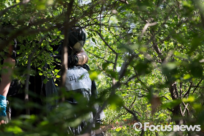 (서울=포커스뉴스) 지난 29일 서울 노원구 수락산 등산로에서 60대 여성을 살해한 피의자 김학봉(61)에 대한 현장검증이 열린 3일 오전 한 경찰 관계자가 피해자 마네킹을 들고 범행현장으로 향하고 있다.