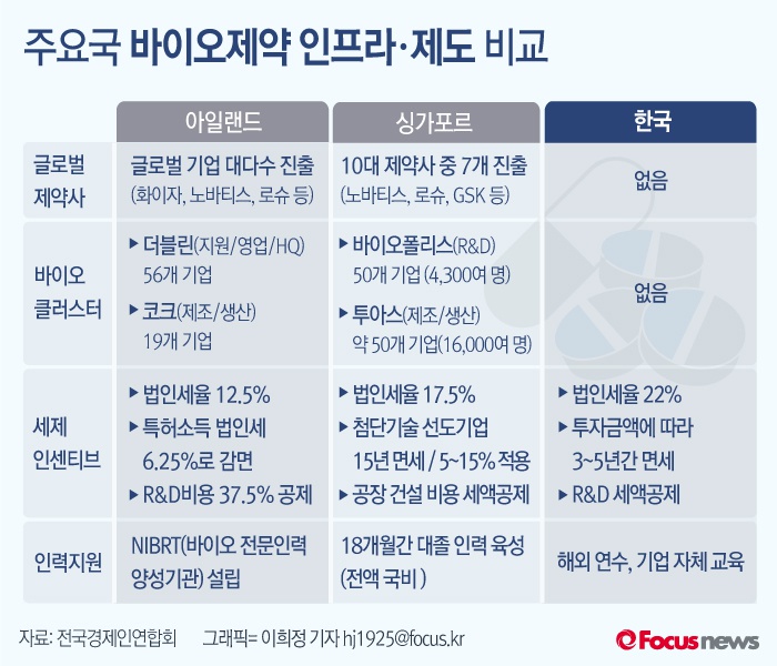 (서울=포커스뉴스) 3일 전국경제인연합회 자료에 따르면 전문가들은 국내 바이오제약 산업이 세계적 제약 기업들을 유치하지 못한다면 고부가가치 R&D, 해외 마케팅으로 이어지는 성공은 어렵다고 조언했다. 한국의 경우 바이오제약 생산능력이 세계 1위인 것에 비해 인프라나 제도가 아일랜드나 싱가포르보다 미흡한 편이다.