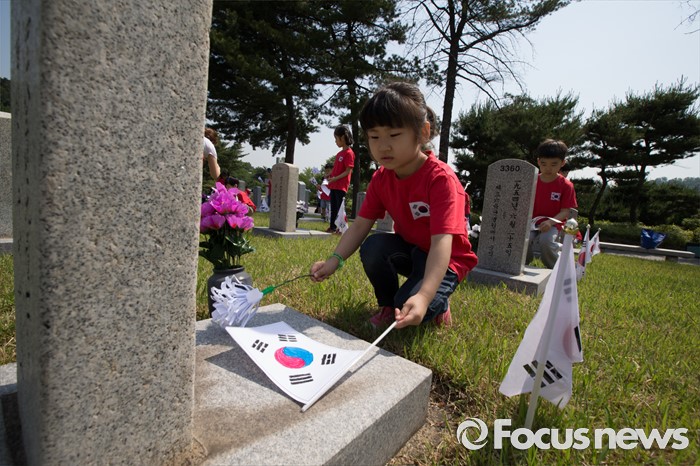(서울=포커스뉴스) 현충일을 사흘 앞둔 3일 오전 서울 동작구 국립서울현충원에서 유치원생들이 국가유공자묘역을 찾아 직접 만든 태극기와 꽃을 헌화하고 있다.