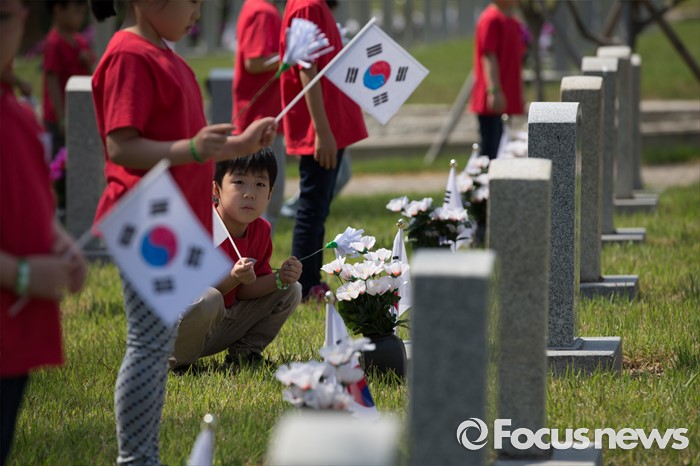 (서울=포커스뉴스) 현충일을 사흘 앞둔 3일 오전 서울 동작구 국립서울현충원에서 유치원생들이 직접 만든 태극기와 꽃을 들고 국가유공자묘역을 찾고 있다.