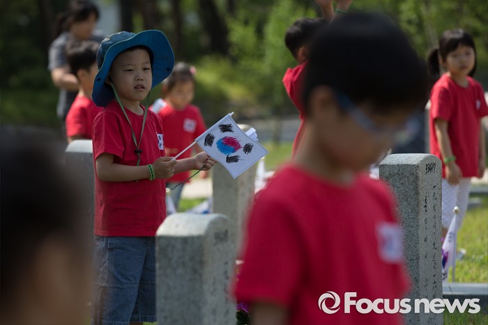 (서울=포커스뉴스) 현충일을 사흘 앞둔 3일 오전 서울 동작구 국립서울현충원에서 유치원생들이 직접 만든 태극기와 꽃을 들고 국가유공자묘역을 찾고 있다.