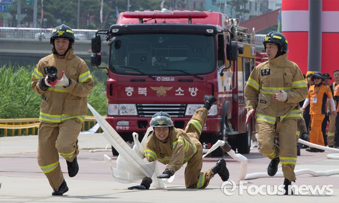 (청주=포커스뉴스) 3일 오전 충북 청주 무심천시민체육공원에서 열린 충북소방기술경연대회에 참가한 소방대원들이 기량을 겨루고 있다.