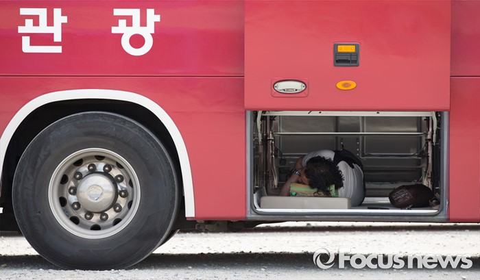(세종=포커스뉴스) 최고 기온이 30도 가까이 오르며 초여름 날씨를 보인 3일 오후 세종시 정부세종청사 주차장에서통근버스 기사들이 트렁크에서 더위를 피해 휴식을 취하고 있다.