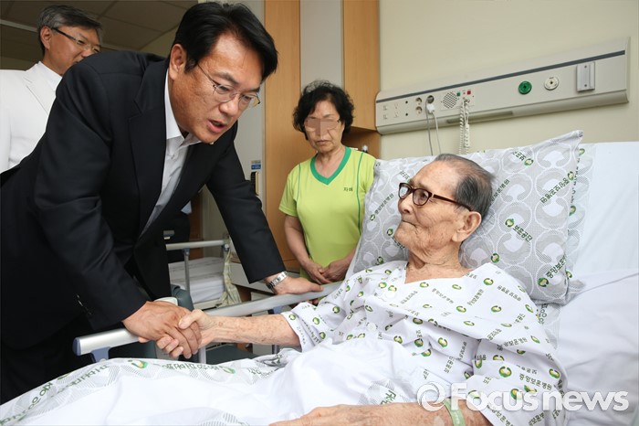 (서울=포커스뉴스) 정진석 새누리당 원내대표가 현충일을 사흘 앞둔 3일 오후 서울 강동구 중앙보훈병원을 방문해 6·25 참전용사를 위문하고 있다.