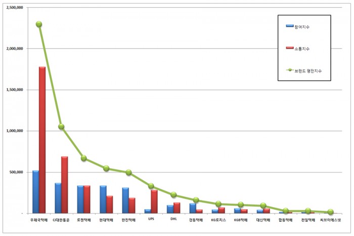 우체국택배와 CJ대한통운에 이어 브랜드 평판지수는 로젠택배, 현대택배, 한진택배, UPS, DHL, 경동택배, KG로지스, KGB택배, 대신택배, 합동택배, 천일택배, 씨브이에스넷 순으로 조사됐다.