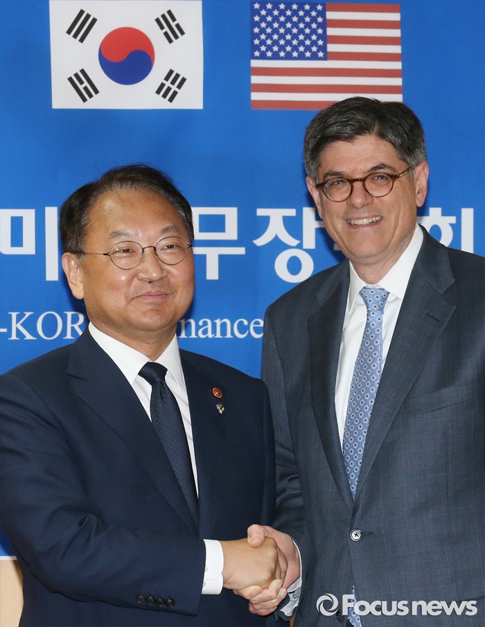 (서울=포커스뉴스) 3일 오후 종로구 정부서울청사에서 열린 한·미 재무장관회의에 참석한 유일호(왼쪽) 경제부총리 겸 기획재정부 장관과 제이콥 루(Jacob Lew) 미국 재무부 장관이 취재진을 향해 포즈를 취하고 있다.