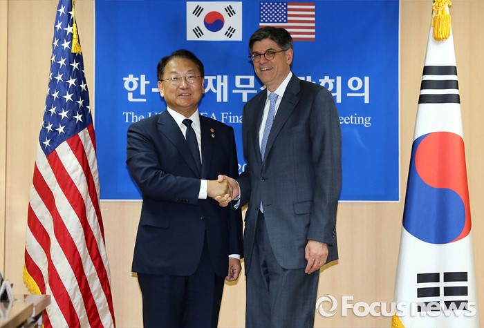 (서울=포커스뉴스) 3일 오후 종로구 정부서울청사에서 열린 한·미 재무장관회의에 참석한 유일호(왼쪽) 경제부총리 겸 기획재정부 장관과 제이콥 루(Jacob Lew) 미국 재무부 장관이 취재진을 향해 포즈를 취하고 있다.