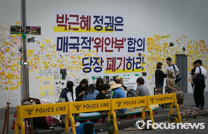(서울=포커스뉴스) 3일 오후 서울 종로구 구 일본대사관 앞에서 한일 위안부 합의 폐기 및 소녀상 철거 반대 대학생행동 관계자들이 소녀상을 지키며 농성하고 있다. 종로경찰서는 이날 낮 12시30분께 소녀상의 머리 부분을 약 40cm 길이의 망치로 수차례 내려친 A(33)씨를 현행범으로 체포해 조사하고 있다고 전했다.
