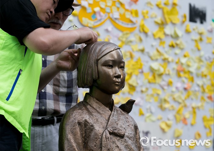(서울=포커스뉴스) 3일 오후 서울 종로구 구 일본대사관 앞에서 농성 중인 한일 위안부 합의 폐기 및 소녀상 철거 반대 대학생행동 관계자들이 소녀상을 살펴보고 있다. 종로경찰서는 이날 낮 12시30분께 소녀상의 머리 부분을 약 40cm 길이의 망치로 수차례 내려친 A(33)씨를 현행범으로 체포해 조사하고 있다고 전했다.
