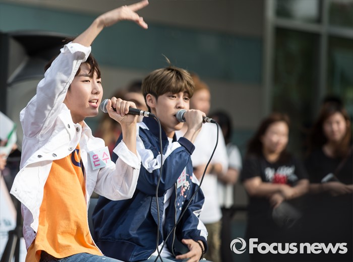 (서울=포커스뉴스) 3일 오후 서울 광진구 건대입구 스타시티 광장에서 가수 송유빈(오른쪽)이 거리공연을 하고 있다.