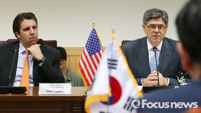 (서울=포커스뉴스) 3일 오후 종로구 정부서울청사에서 열린 한·미 재무장관회의에 참석한 제이콥 루(Jacob Lew) 미국 재무부 장관이 발언하고 있다. 왼쪽은 마크 리퍼트 주한미국대사.