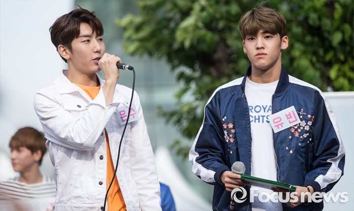 (서울=포커스뉴스) 3일 오후 서울 광진구 건대입구 스타시티 광장에서 가수 송유빈(오른쪽)이 거리공연을 하고 있다.