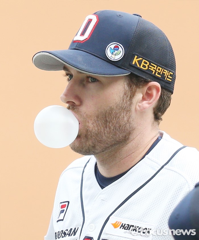 (서울=포커스뉴스) 3일 서울 잠실구장에서 열린 2016프로야구 SK-두산 경기에서 두산 에반스가 경기 시작을 기다리며 풍선 껌을 불고 있다.