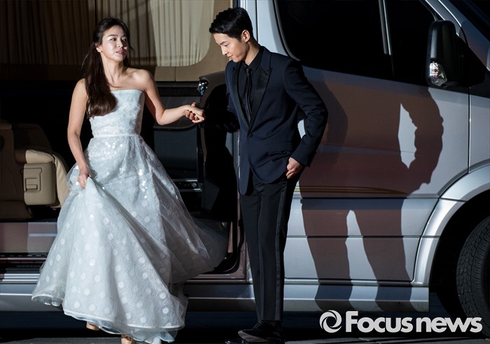(서울=포커스뉴스) 3일 오후 서울 동대문구 경희대학교 평화의전당에서 열린 '2016 백상예술대상'에 참석한 배우 송중기-송혜교가 레드카펫을 밟고 있다.