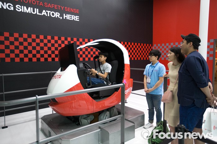 (부산=포커스뉴스) 3일 오후 부산 해운대구에 위치한 벡스코에서 열린 '2016 부산국제모터쇼'에서 관람객들이 토요타 부스에 마련된 차량 운전 시뮬레이션을 하고 있다.