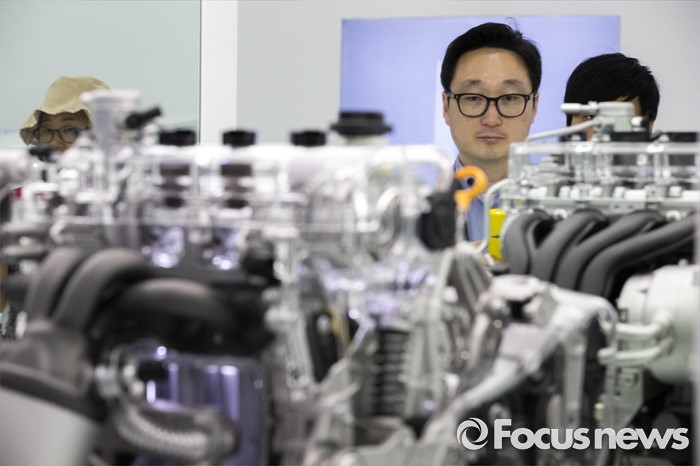 (부산=포커스뉴스) 3일 오후 부산 해운대구에 위치한 벡스코에서 열린 '2016 부산국제모터쇼'에서 관람객들현대 부스에 진열된 엔진을 유심히 살펴보고 있다.
