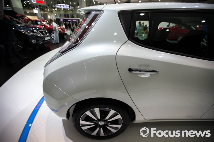 (부산=포커스뉴스) 3일 오후 부산 해운대구에 위치한 벡스코에서 열린 '2016 부산국제모터쇼'에 토요타의 전기차 '리프' 차량이 전시되어 있다.