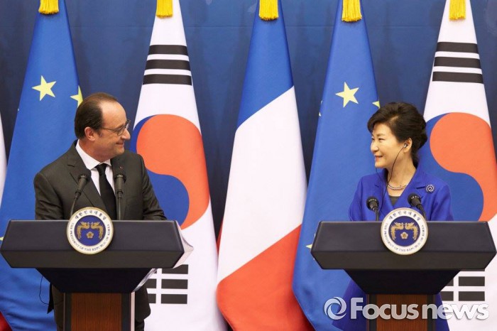 (서울=포커스뉴스) 박근혜 대통령과 프랑수아 올랑드 프랑스 대통령이 3일(현지시간) 한·프 양국의 충실한 유엔 안전보장이사회 대북제재 결의 이행을 골자로한 '한·불수교 130주년 기념 공동선언'을 채택했다.