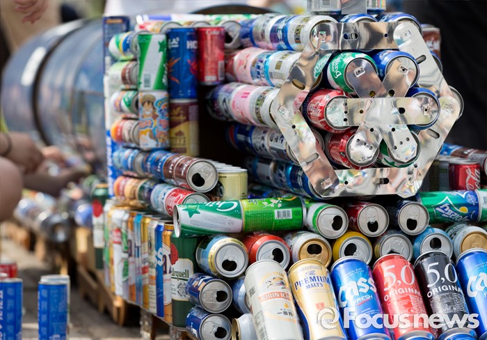 (서울=포커스뉴스) 4일 오후 서울 마포구 연남동 경의선 숲길에서 시민들이 버려진 음료캔으로 경의선 화물기차를 만들고 있다.