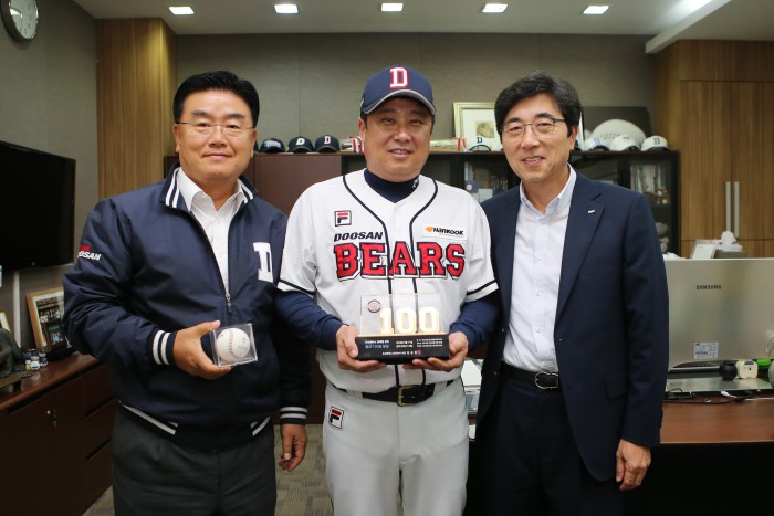 두산 베어스 김승영 대표와 김태룡 전무의 노력과 헌신에 두산은 프로야구 강자로 자리매김할 수 있었다.프로야구 두산 베어스 김태룡 단장이 전무로 승진했다. 사진은 두산 베어스 김승영 대표, 김태형 감독, 김태룡 단장(오른쪽부터)이 김태형 감독 100승을 축하하며 기념촬영하고 있다. <사진제공=두산 베어스>