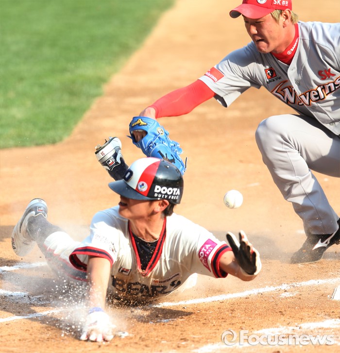 | △ 실책을 틈타 홈을 파고드는 두산 정수빈 |