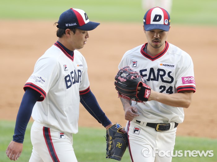 (서울=포커스뉴스) 5일 서울 잠실구장에서 열린 2016프로야구 SK-두산 경기에서 두산 투수 안규영이 5회초 2사 2,3루의 실점 위기에서 SK 이명기를 2루 땅볼로 잡고 2루수 오재원을 맞이하고 있다.