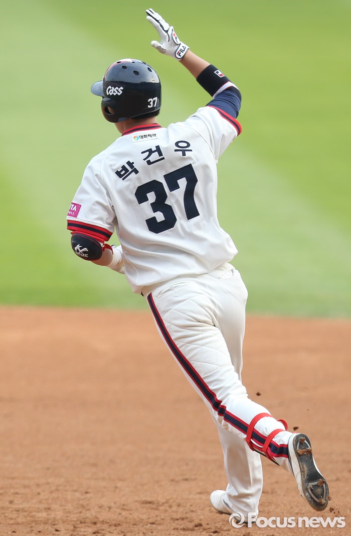 (서울=포커스뉴스) 5일 서울 잠실구장에서 열린 2016프로야구 SK-두산 경기 3회말 두산 선두타자 박건우가 좌월 솔로 홈런을 치고 달려나가고 있다.