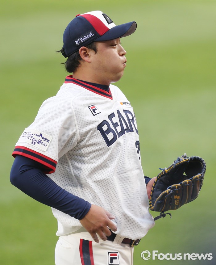 (서울=포커스뉴스) 5일 서울 잠실구장에서 열린 2016프로야구 SK-두산 경기 7회 무사 1루에서 두산 투수 안규영이 밝은 표정으로 투수 교체를 기다리고 있다.