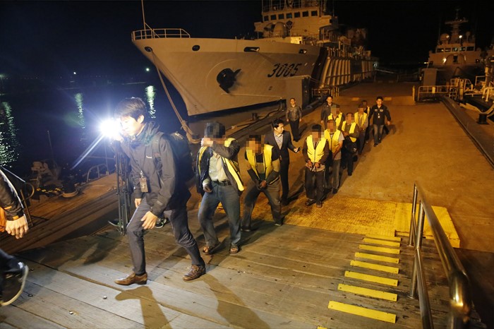(서울=포커스뉴스) 6일 오전 인천해양경비안전서 전용부두에 서해 연평도 북방한계선(NLL) 인근에서 조업하다 우리 어민들에게 나포된 중국어선 선원들이 입국 후 조사를 위해 이동하고 있다. <사진제공=인천해경>