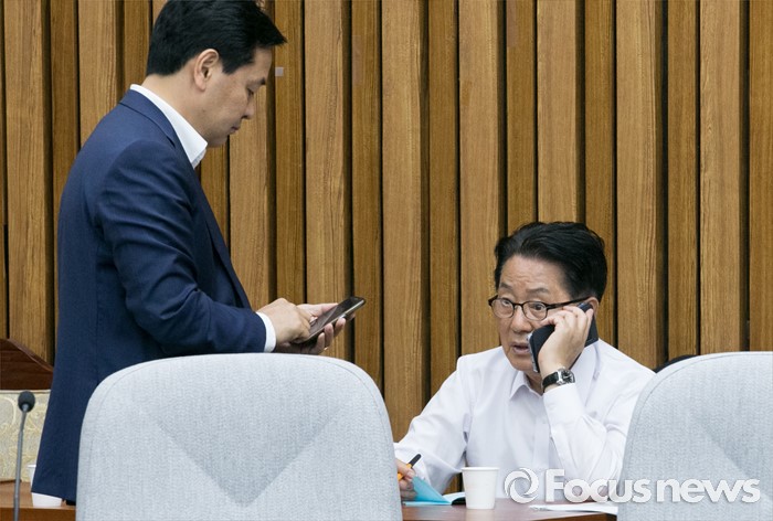 (서울=포커스뉴스) 6일 오전 서울 여의도 국회에서 박지원 국민의당 원내대표가 20대 국회 원구성 협상 등과 관련 기자간담회에 앞서 누군가와 통화를 하고 있다. 왼쪽은 김관영 원내수석부대표.